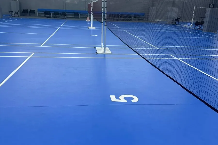 - Mặt sân được trải thảm cao su màu xanh dương chống trơn trượt, chống thấm, bền đẹp, độ đàn hồi tốt, đảm bảo sự chắc chắn cho người chơi trên từng bước di chuyển, hạn chế chấn thương ngoài ý muốn.