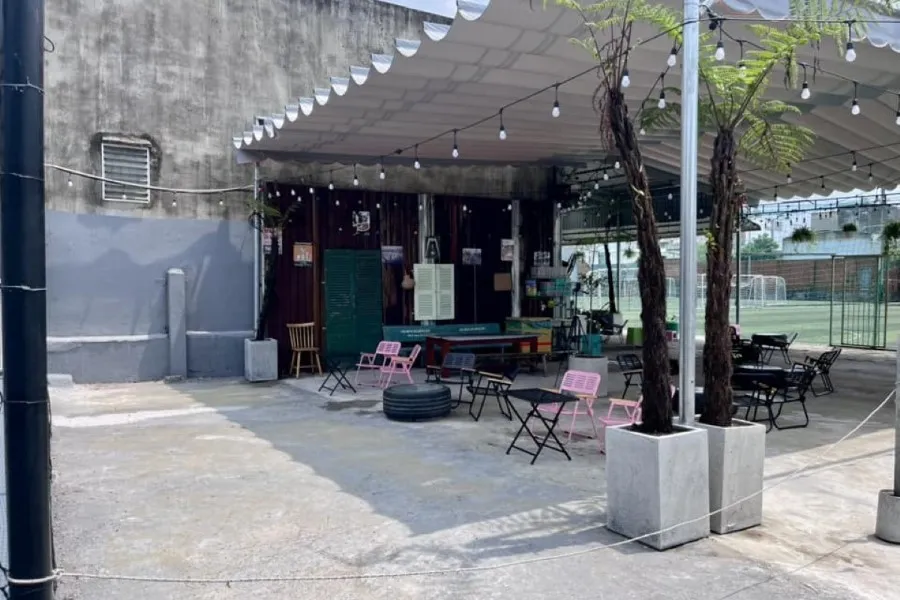- Khu vực nghỉ ngơi được bố trí đầy đủ bàn ghế và quạt máy, giúp người chơi thư giãn sau khi vận động.