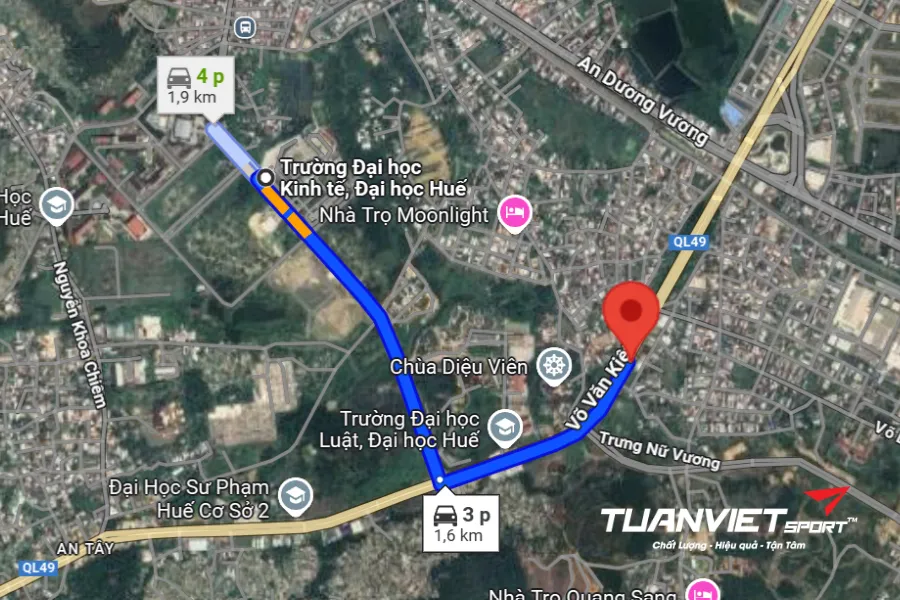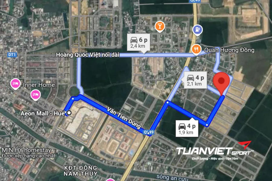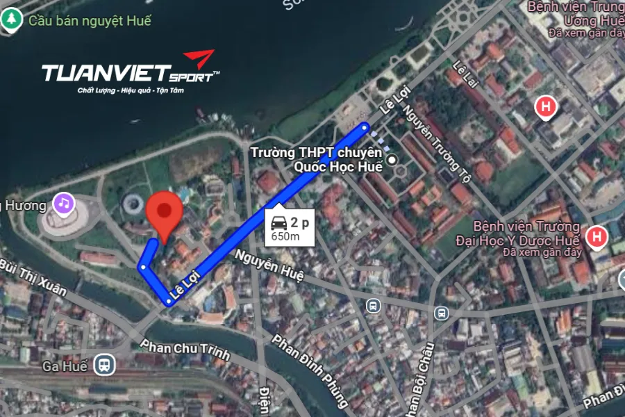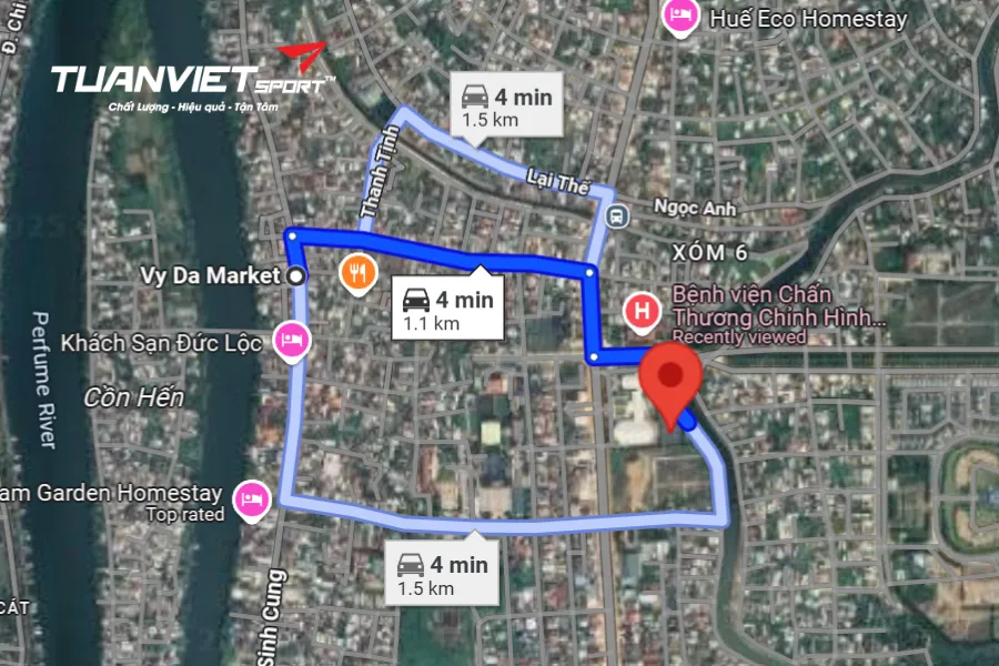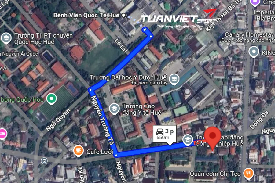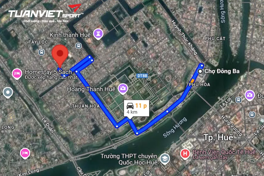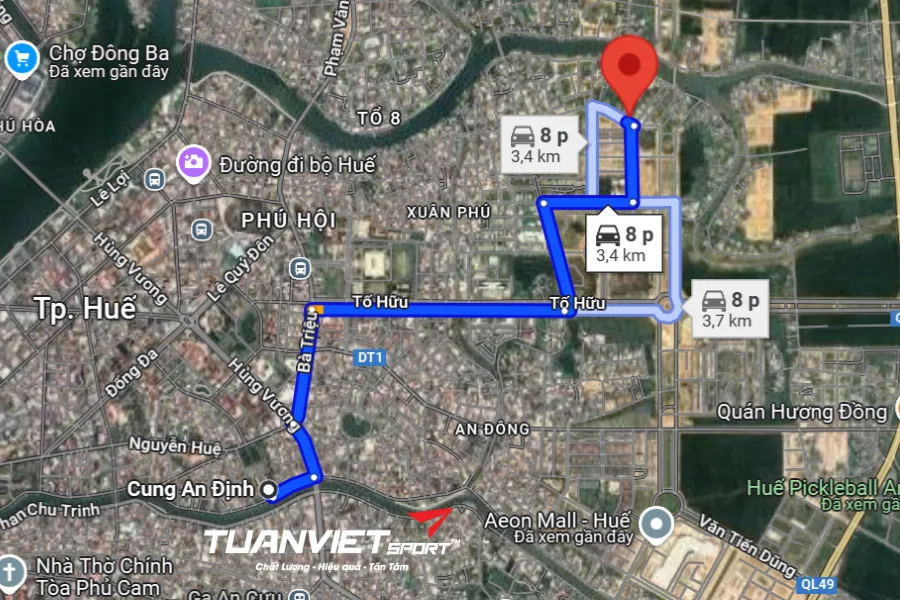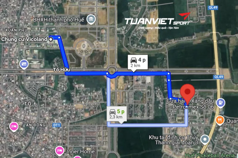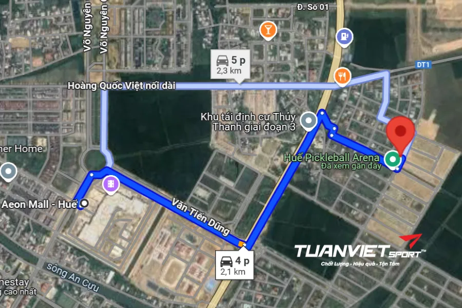 - Vị trí sân: Pickleball Arena – Huế nằm gần khu dân cư yên tĩnh, có hạ tầng giao thông tốt, dễ dàng tiếp cận từ các tuyến đường lớn như Võ Nguyên Giáp hoặc Tố Hữu. Đây là khu vực đang phát triển, phù hợp cho các hoạt động thể thao và giải trí. Từ Aeon Mall Huế, đi về hướng Tây Nam, rẽ phải tại cửa hàng ALDO và đi dọc theo Võ Nguyên Giáp khoảng 140m. Khi đến vòng xuyến, theo lối ra thứ nhất vào đường Văn Tiến Dũng, tiếp tục di chuyển khoảng 750m. Khi đến ngã ba, rẽ trái vào đường Võ Chí Công, đi thêm khoảng 350m, sau đó rẽ phải vào đường Nguyễn Công Duẫn. Từ đây, tiếp tục đi thẳng 400m, rồi rẽ trái vào đường Lưu Nhân Chú, sân sẽ nằm bên trái.