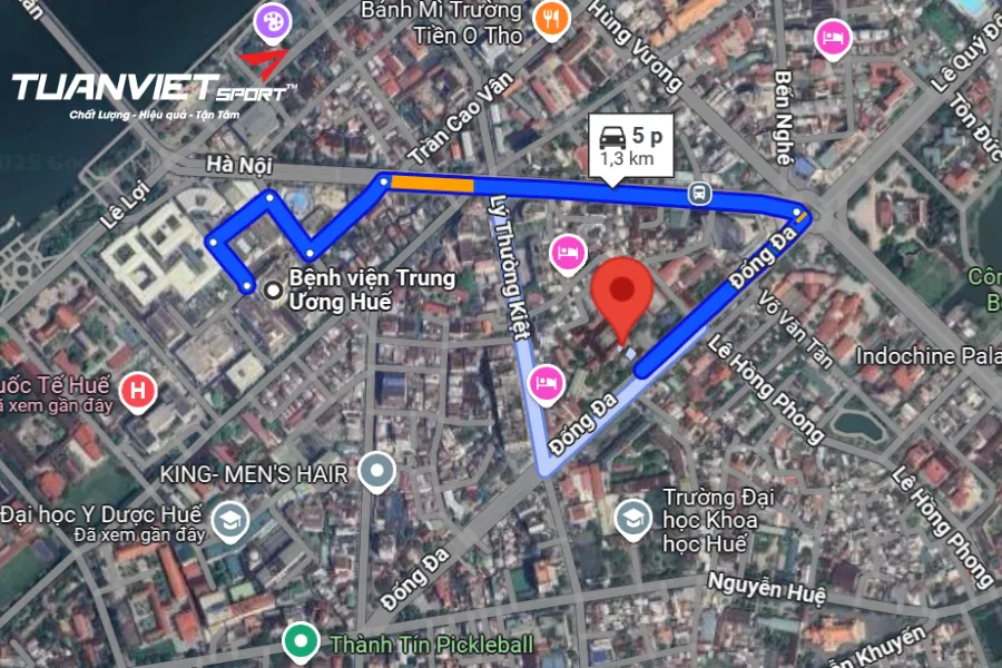 - Vị trí sân: Pickleball BMC Huế tọa lạc tại vị trí trung tâm, chỉ cách bùng binh Hùng Vương vài trăm mét. Đây là khu vực sầm uất, dễ tìm và thuận tiện cho việc di chuyển từ các phường như Vĩnh Ninh, Phú Hội hay An Cựu. Vị trí mặt tiền đường lớn giúp người chơi dễ dàng tiếp cận, đồng thời khu vực xung quanh có nhiều tiện ích. Từ Bệnh viện Trung Ương Huế, đi về hướng Tây Bắc về hướng đường Hai Bà Trưng khoảng 100m. Tiếp tục rẽ phải rồi rẽ trái vào đường Trần Cao Vân. Di chuyển thêm khoảng 140m, rẽ phải vào đường Hà Nội. Từ đây, đi thẳng khoảng 600m, tại vòng xuyến, chọn lối ra thứ nhất để vào đường Đống Đa. Đi thêm khoảng 300m nữa, sân sẽ nằm bên phải.