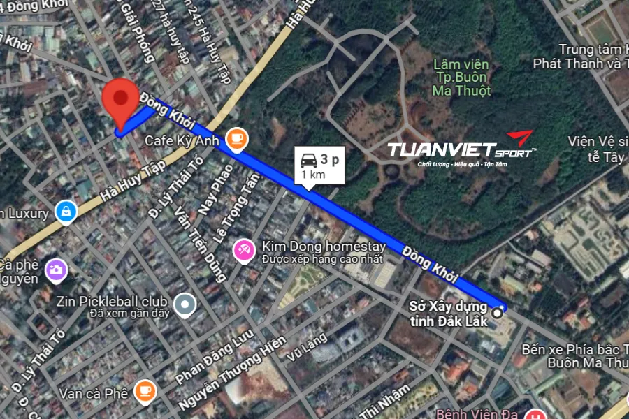 - Vị trí sân: Pickleball Đồng Khởi là một trong những sân chơi Pickleball nổi bật trong khu vực, thu hút nhiều người đam mê thể thao tham gia. Sân nằm gần nhiều tuyến đường, thuận tiện cho việc di chuyển và xung quanh có nhiều dịch vụ đa dạng. Từ Sở Xây dựng tỉnh Đắk Lắk, đi về hướng Tây Bắc dọc theo đường Đồng Khởi khoảng 950 mét, đi qua Phong Lan Cây cảnh Nam Tây Nguyên ở bên trái. Sau đó, rẽ trái tại tiệm Mùa Tây Nguyên Trái cây tươi đóng hộp. Tiếp tục đi thêm khoảng 110 mét, sân sẽ nằm ở bên trái.