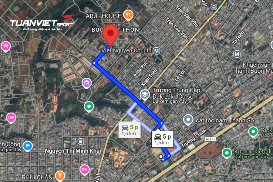 Vị trí sân: CLB Pickleball Kita nằm trong khu dân cư yên tĩnh, cách trung tâm thành phố khoảng 3–4 km, thuận tiện cho việc di chuyển từ các khu vực lân cận. Xung quanh sân có nhiều tiện ích và dịch vụ đa dạng. Từ Quảng Trường Buôn Ma Thuột, đi theo hướng Tây Nam lên đường Trường Chinh khoảng 180m rồi rẽ trái vào đường Trần Hưng Đạo. Tiếp tục đi thẳng, rẽ trái vào đường Nguyễn Tất Thành. Sau đó, đi khoảng 500m và rẽ phải vào đường Bùi Thị Xuân. Từ đây, tiếp tục thêm 300m, rẽ phải vào hẻm 52, sau đó rẽ trái vào trong hẻm, đi thêm vài chục mét là sẽ đến sân.