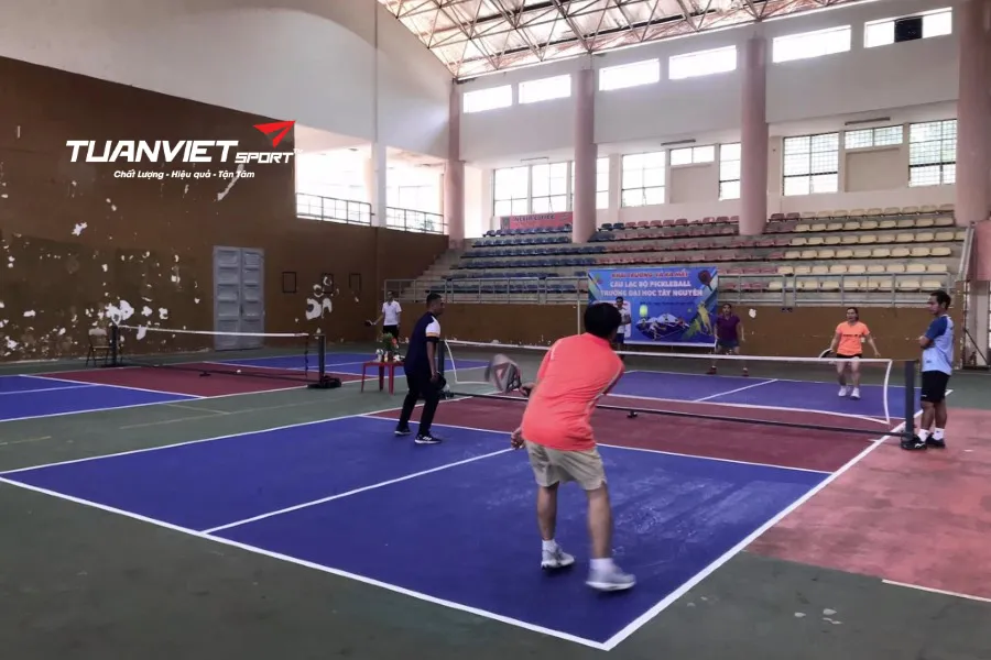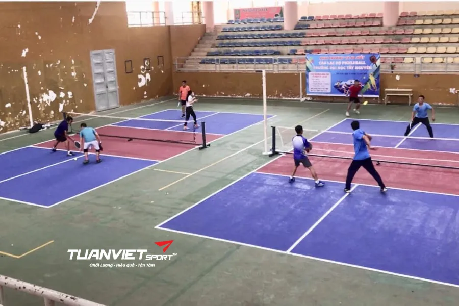 - Vị trí sân: Câu lạc bộ Pickleball Trường Đại học Tây Nguyên tọa lạc trong khuôn viên Nhà thi đấu của trường. Vị trí này thuận tiện cho sinh viên và người dân địa phương tham gia tập luyện. Từ Bến xe phía Nam Buôn Ma Thuột, đi về hướng Đông Nam khoảng 130m, rồi rẽ trái vào đường Phan Huy Chú. Tiếp tục đi thẳng 140m, sau đó, rẽ trái vào đường Lê Duẩn/CT02/QL14, tiếp tục di chuyển khoảng 900m. Rẽ phải vào lối nhỏ, rồi rẽ trái vào khuôn viên Trường Đại học Tây Nguyên. Nhà thi đấu của trường – nơi tổ chức CLB Pickleball – sẽ nằm ngay bên trong.