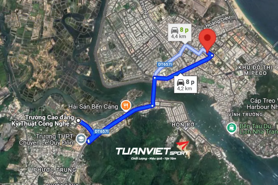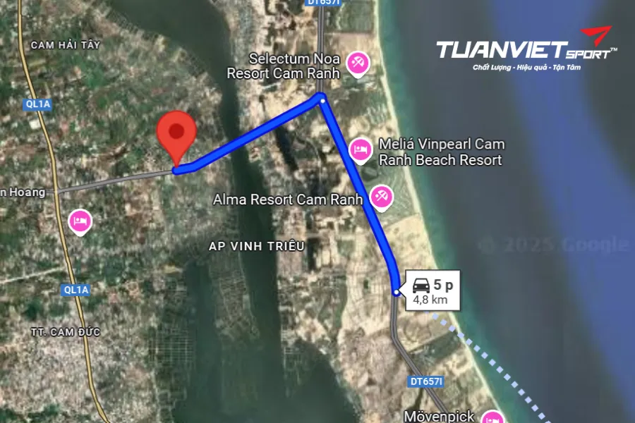 - Vị trí sân: Pickleball Titan thuộc vùng ven biển phía Nam tỉnh, gần các tuyến đường lớn như Quốc lộ 1A và đường Nguyễn Tất Thành, thuận tiện cho việc di chuyển từ cả Nha Trang lẫn sân bay Cam Ranh. Xuất phát từ Bãi Dài, đi theo hướng Bắc lên đường Nguyễn Tất Thành (ĐT657I), chạy thẳng khoảng 2,6 km, đi qua NHU DANG CAM RANH SPA nằm bên phải. Khi đến vòng xuyến, rẽ theo lối ra thứ hai để vào đường Đinh Tiên Hoàng. Tiếp tục di chuyển thêm 2,1 km sẽ thấy sân nằm bên phải đường.