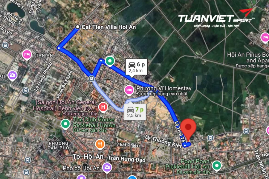 - Vị trí sân: Pickleball Hội An nằm gần trung tâm phố cổ, thuận tiện cho cả cư dân địa phương và du khách đến tham quan và trải nghiệm. Khu vực xung quanh là khu dân cư yên tĩnh, gần các quán ăn, quán cà phê và dịch vụ tiện ích. Từ Cat Tien Villa, đi theo Lê Hồng Phong hướng Tây Nam khoảng 300m, sau đó, rẽ trái vào đường Tôn Đức Thắng và tiếp tục đi thêm 500m. Rẽ trái vào đường Thích Quảng Đức, đi khoảng 210m đến ngã ba thì rẽ phải vào Lý Thái Tổ. Tiếp tục đi trên Lý Thái Tổ khoảng 1,4 km, đi ngang Quán Cafe 409, rồi rẽ trái vào đường Lý Thường Kiệt. Đi thêm 48m, sân sẽ nằm bên tay trái.