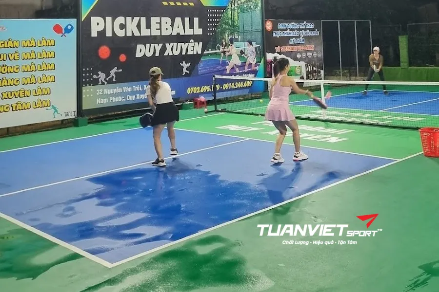 - Vị trí sân: Pickleball Duy Xuyên nằm trong khu dân cư trung tâm thị trấn Nam Phước, sân dễ dàng tiếp cận từ các tuyến đường chính. Khu vực xung quanh có nhiều tiện ích thuận tiện cho người chơi thư giãn và nghỉ ngơi sau khi vận động. Từ Bảo hiểm Xã hội huyện Duy Xuyên, di chuyển theo hướng Tây trên đường Hùng Vương khoảng 650 m. Sau đó, rẽ phải tại quán Bitcoin Coffee vào đường Nguyễn Văn Trỗi. Tiếp tục đi thêm khoảng 400 m, sẽ thấy sân nằm bên phải.
