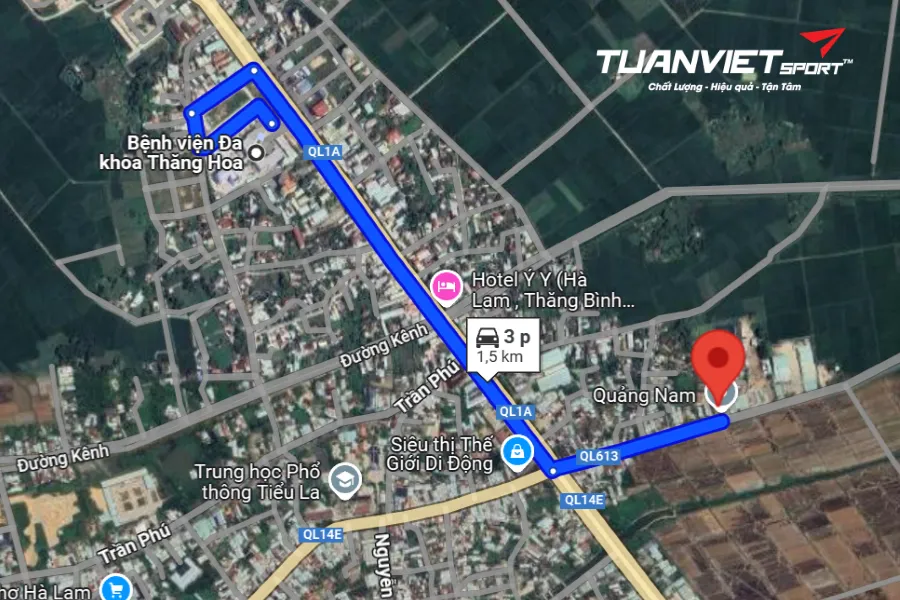 - Vị trí sân: Pickleball Thăng Bình nằm trong khuôn viên của Trung tâm Thể thao Phạm Gia. Vị trí này rất thuận tiện cho việc di chuyển, dễ dàng tiếp cận từ các khu vực lân cận như Tam Kỳ, Hội An. Từ Bệnh viện Đa khoa Thăng Hoa, đi về hướng Tây Bắc khoảng 160m, sau đó rẽ phải vào đường Nguyễn Hoàng/QL1A và tiếp tục đi thêm 59m. Tiếp tục rẽ phải một lần nữa vào QL1A, đi thêm khoảng 120m rồi rẽ phải. Tiếp tục đi thẳng khoảng 800m, khi đến FPT Shop, rẽ trái vào đường Phạm Phú Thứ/QL613, đi thêm khoảng 290m, sân sẽ nằm bên tay trái.