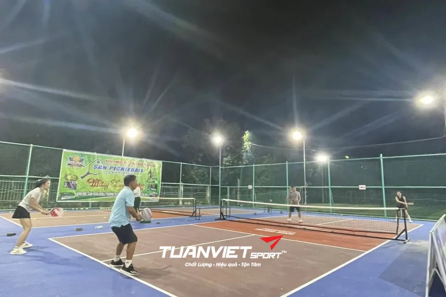 - Hệ thống chiếu sáng hiện đại được bố trí đều khắp sân, đảm bảo ánh sáng đầy đủ cho việc chơi Pickleball suốt cả ngày lẫn đêm.