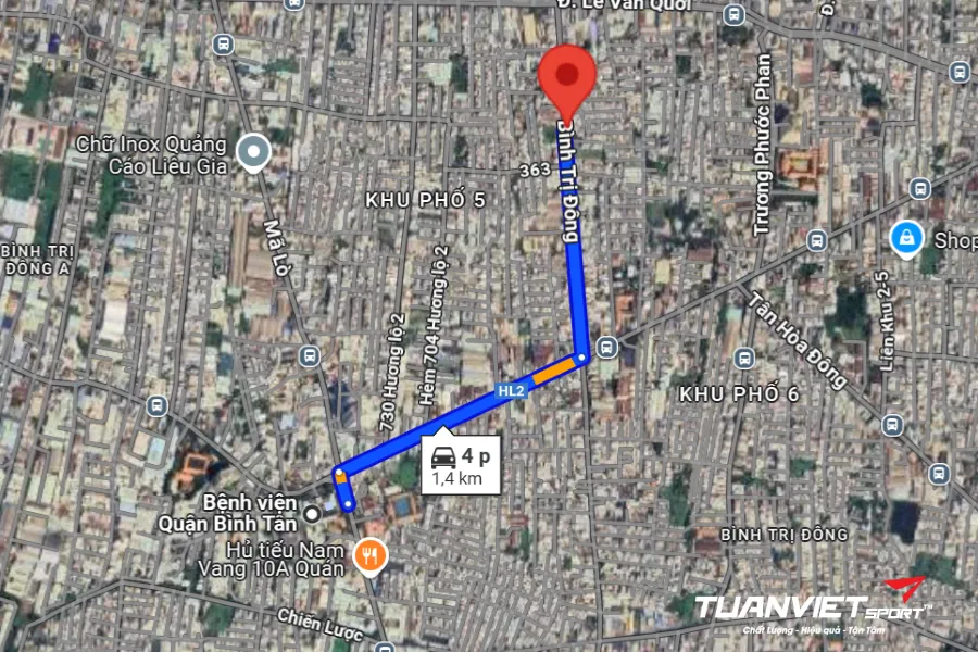 - Vị trí cửa hàng: VNB Sports Bình Tân nằm trên trục đường huyết mạch kết nối khu dân cư đông đúc Bình Trị Đông A với các tuyến giao thông lớn. Khu vực xung quanh tập trung nhiều sân cầu lông, trường học và khu dân cư trẻ, rất thuận tiện cho người chơi thể thao ghé mua sắm hoặc bảo dưỡng dụng cụ. Từ Bệnh viện Quận Bình Tân, đi về hướng Bắc lên đường Mã Lò khoảng 85m, sau đó rẽ phải gần Cửa hàng Mắt Kính Sao Việt. Tiếp tục đi thẳng khoảng 700m, rẽ trái sau Nhà thuốc Pharmacity. Đi thêm 600m nữa, cửa hàng sẽ nằm bên phải.