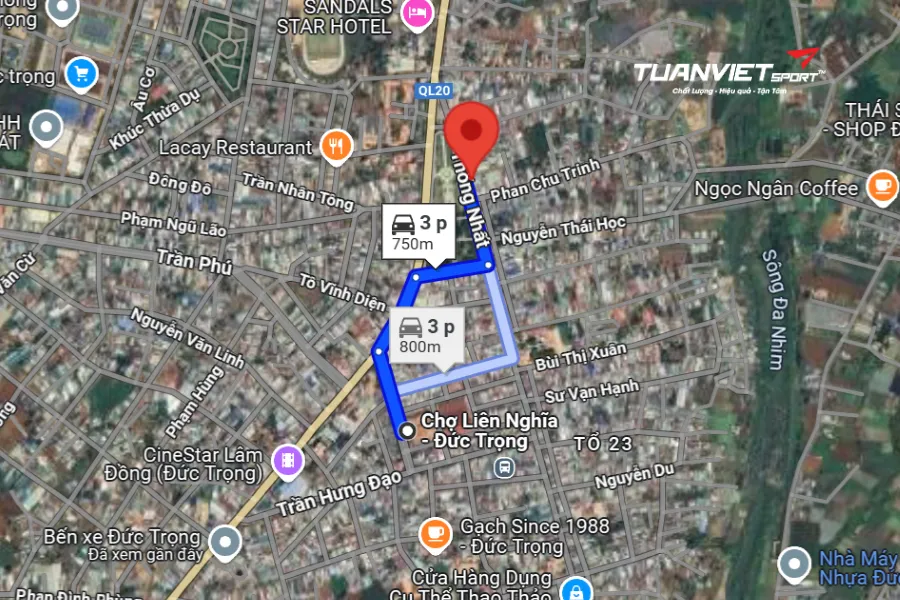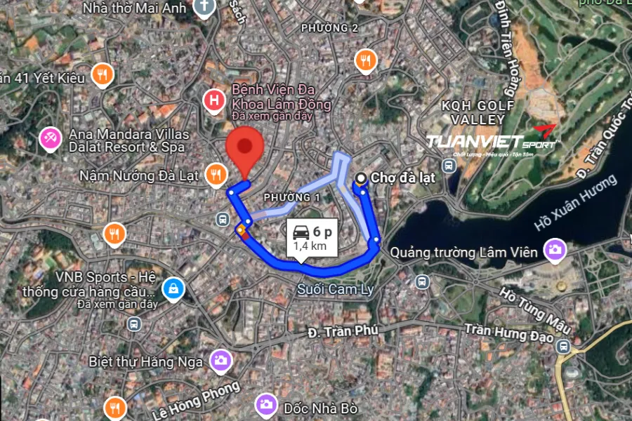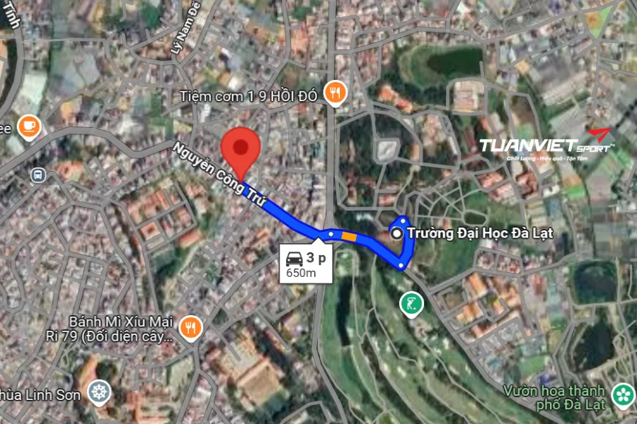 - Vị trí cửa hàng: Việt Badminton – Lâm Đồng nằm ngay trung tâm thành phố, gần các trục đường chính và khu tiện ích, giúp khách dễ dàng ghé mua sắm hoặc vận chuyển dụng cụ thể thao nhanh chóng. Từ Trường Đại học Đà Lạt, đi về hướng Đông Bắc khoảng 30m, sau đó rẽ phải vào đường Trần Nhân Tông, đi tiếp khoảng 210m rồi nhập vào đường Nguyễn Công Trứ. Tiếp tục di chuyển thêm 290m, cửa hàng sẽ nằm bên phải.