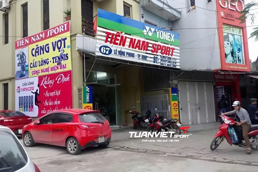 - Điểm nổi bật: Tiến Nam Sport là một trong những địa chỉ uy tín hàng đầu dành cho người chơi cầu lông tại Nghệ An. Cửa hàng chuyên cung cấp sản phẩm chính hãng từ các thương hiệu nổi tiếng như Yonex, Mizuno, Apacs… với đầy đủ các mặt hàng từ vợt, giày, quần áo đến phụ kiện, phù hợp cho cả người chơi phong trào lẫn vận động viên chuyên nghiệp. Đội ngũ nhân viên tại đây có kiến thức chuyên môn cao, luôn sẵn sàng tư vấn tận tình và hỗ trợ khách hàng chọn sản phẩm phù hợp nhất. Bên cạnh đó, với vị trí đắc địa ngay trung tâm thành phố, không gian mua sắm thuận tiện cùng dịch vụ hậu mãi chuyên nghiệp, Tiến Nam Sport xứng đáng là địa chỉ đáng tin cậy cho cộng đồng yêu cầu lông tại khu vực.