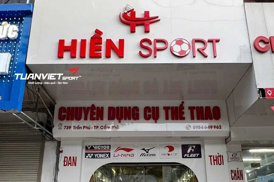 - Điểm nổi bật: Hiền Sport là địa điểm đáng tin cậy cho người chơi cầu lông tại Quảng Ninh, chuyên cung cấp các dòng vợt chính hãng từ những thương hiệu uy tín như Yonex, Lining, Mizuno, Kumpoo, Victor, VS,… Cửa hàng có không gian mua sắm thoáng đãng, dễ quan sát, giúp khách hàng lựa chọn sản phẩm thoải mái và thuận tiện. Điểm nổi bật của cửa hàng còn nằm ở dịch vụ đan vợt điện tử chuyên nghiệp, bảo hành rõ ràng, cùng đội ngũ nhân viên am hiểu, tư vấn tận tình.