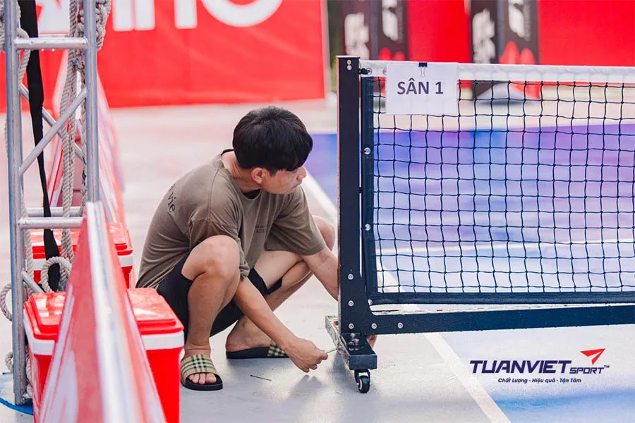 Tiếp theo, hãy lấy phần lưới ra khỏi túi và trải phẳng. Phần viền trên của lưới có dải màu trắng cần được hướng ra ngoài. Gắn hai đầu màu đỏ của lưới vào các cột hai bên khung, sau đó sử dụng thanh chống đi kèm để dựng phần giữa lưới. Thanh chống này giúp giữ độ cao và độ căng ổn định cho toàn bộ mặt lưới. Cuối cùng, bạn căng nhẹ hai đầu lưới bằng dây điều chỉnh màu trắng cho đến khi lưới nằm ngang và cân đối.