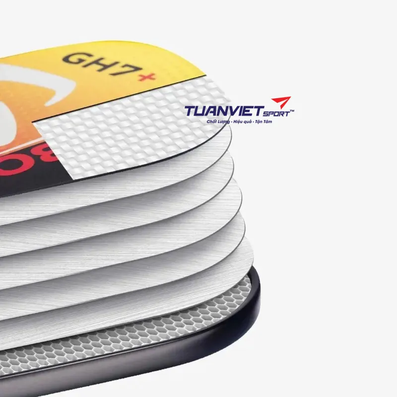 - Lõi ổn định 13mm, cảm giác mềm mại: Phiên bản mới của GH7+ sử dụng lõi tổ ong Polypropylene dày 13mm, tạo sự ổn định vượt trội và cảm giác đánh êm tay. Mặt vợt gồm 6 lớp sợi thủy tinh, mang lại khả năng kiểm soát ổn định và tăng lực khi cần. Ngoài ra, cây vợt còn được tích hợp công nghệ Hyper-Bite Spin giúp tạo xoáy tối đa. Với tay cầm đúc ôm tay, GH7+ đem lại sự thoải mái vượt trội – điều mà nhiều vợt cùng phân khúc khó đạt được.